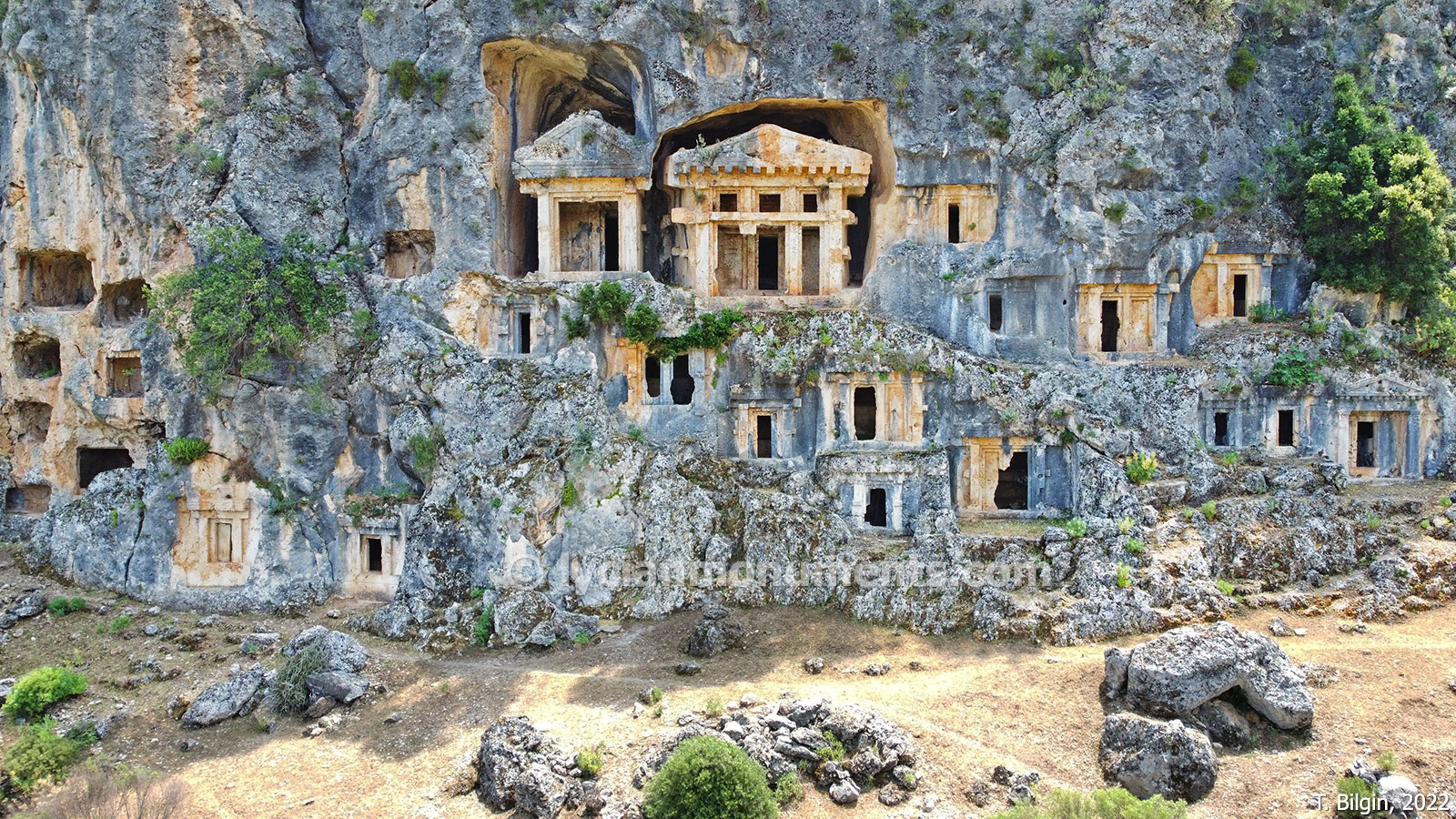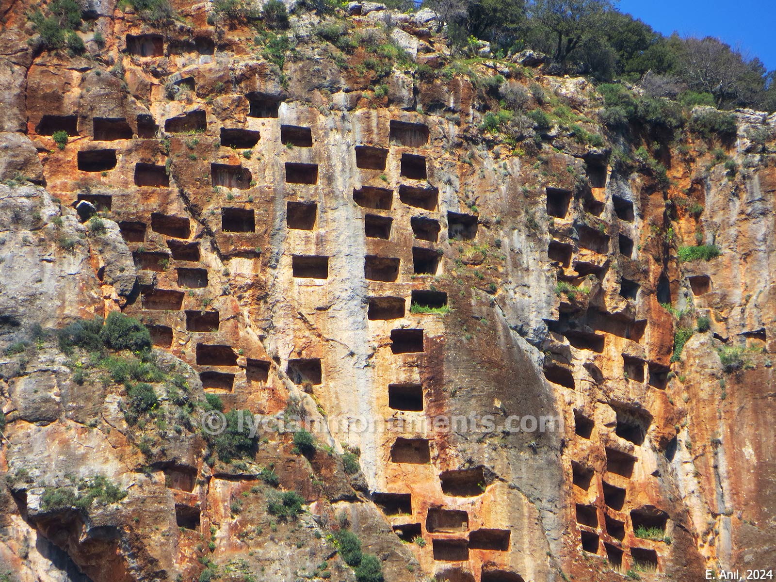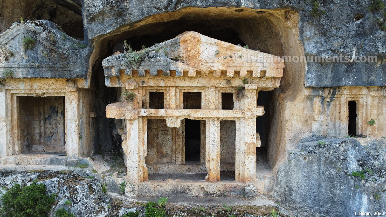 The most striking structures in the city are the tombs. It is possible to see almost all types of Lycian tomb architecture in Pinara. Hundreds of pigeonhole-type rock-cut tombs cover the steep slopes of the upper acropolis. Some of the most beautiful examples of wooden architecture-imitating house-type rock tombs in Lycia are found on the rocks around the city. About a dozen of them also contain Lycian inscriptions. One of these classical rock-cut tombs is particularly striking with its wall reliefs that depict the city of Pinara. These are quite helpful to understand the urban texture of the city during the dynastic period. There are also pillar tombs from the dynastic period and sarcophagus tombs from various periods.
