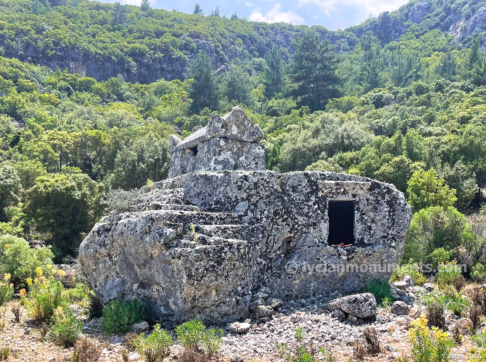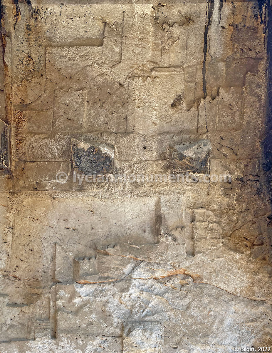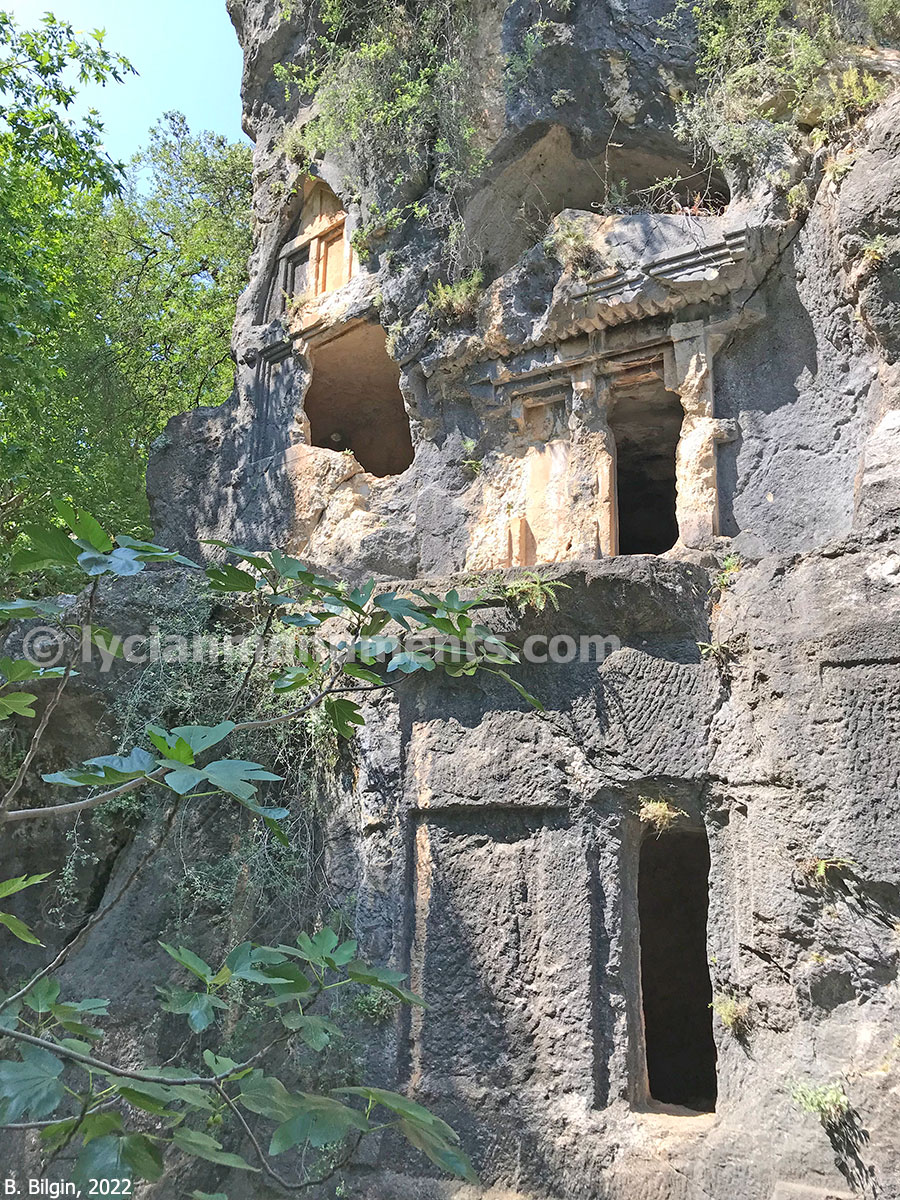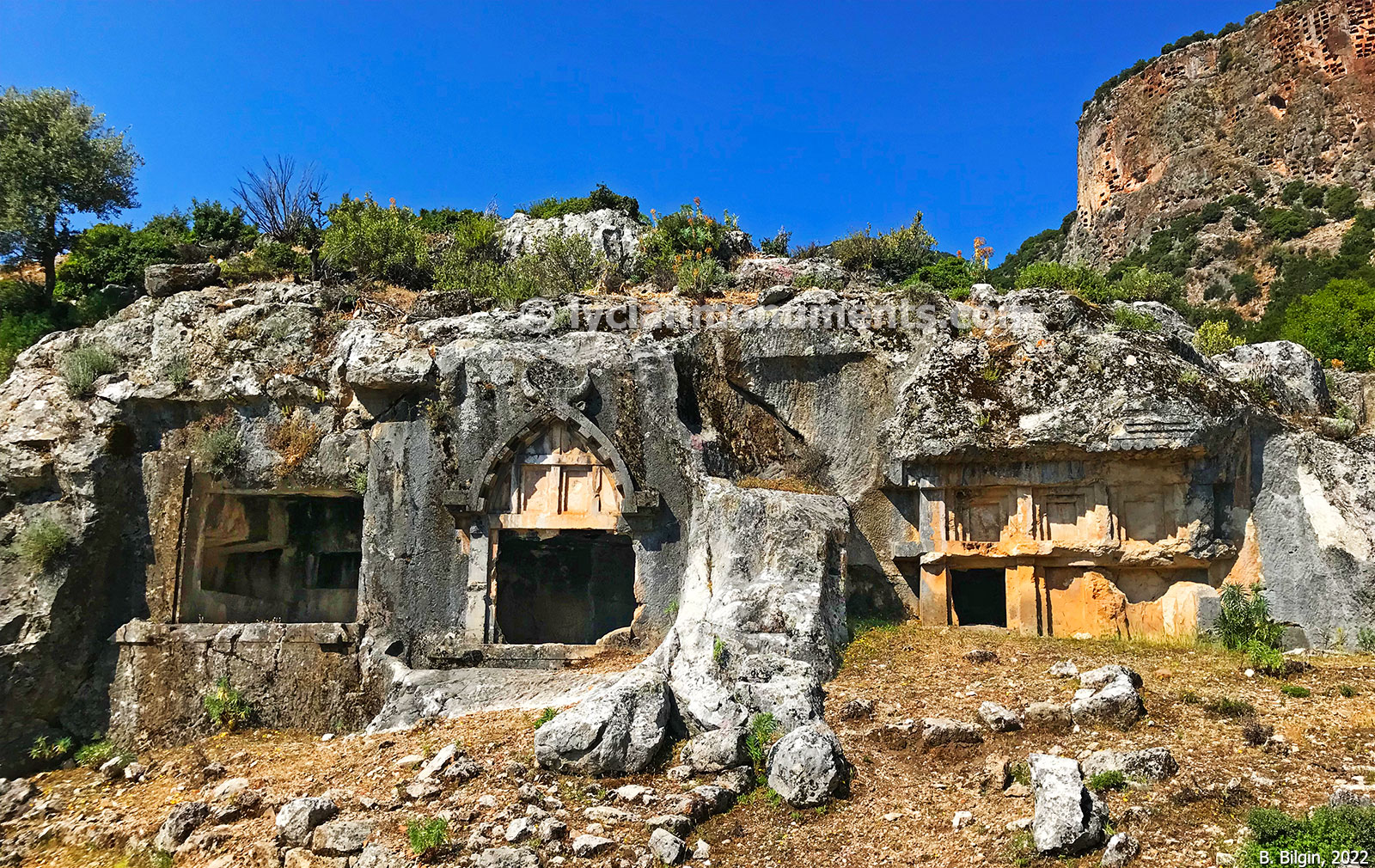 The most striking structures in the city are the tombs. It is possible to see almost all types of Lycian tomb architecture in Pinara. Hundreds of pigeonhole-type rock-cut tombs cover the steep slopes of the upper acropolis. Some of the most beautiful examples of wooden architecture-imitating house-type rock tombs in Lycia are found on the rocks around the city. About a dozen of them also contain Lycian inscriptions. One of these classical rock-cut tombs is particularly striking with its wall reliefs that depict the city of Pinara. These are quite helpful to understand the urban texture of the city during the dynastic period. There are also pillar tombs from the dynastic period and sarcophagus tombs from various periods.