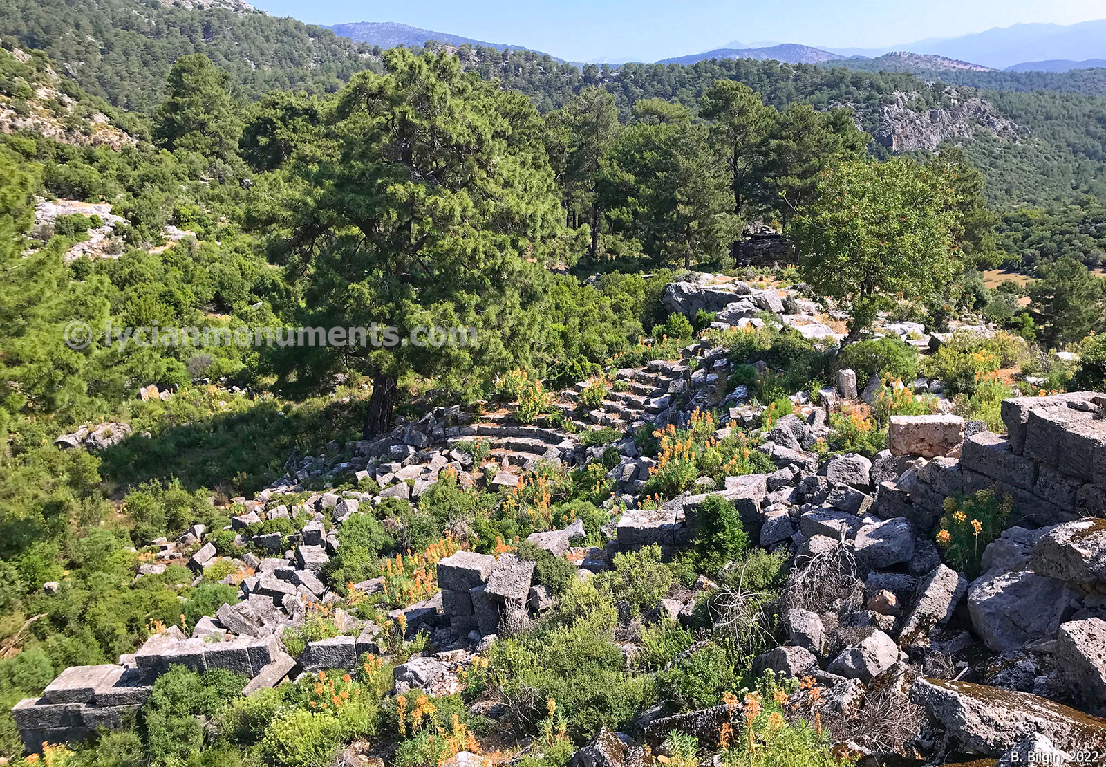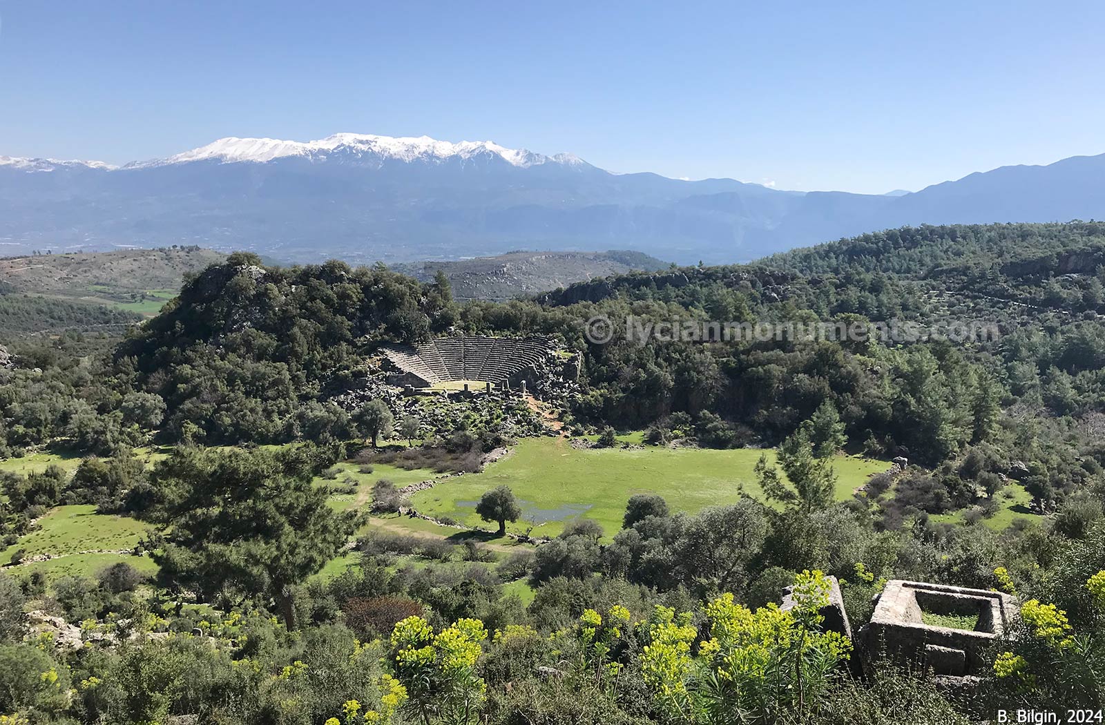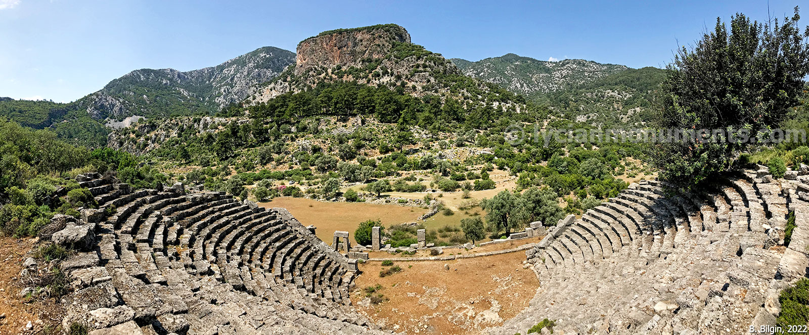 The city of Pinara is located on the eastern slopes of the South Antikragos Mountains (Baba Dağı) to the east of Fethiye Bay and overlooks the Xanthos Valley. It was built on terraces rising from 330 meters to 715 meters. It is bordered by the cities of Xanthos in the south and Tlos in the northeast. The Lycian name of the city was Pinale (or Pilleñni). Ancient writers rarely mention Pinara. Charles Fellows was the first to identify the city in the modern period. Since no excavation work has been carried out yet, the oldest findings do not go back any further than the dynastic period, but it is known to be much older because the name of the city is also mentioned as Pinali in the 13th century BCE Hittite texts. There are coins minted with the name of the city from the dynastic period. It was also one of the first cities to mint money under the name of the Lycian League in the 2nd century BCE. In the Roman period, as stated by Strabo, Pinara was one of the 6 big cities in the Lycian League with 3 voting rights each. However, in later periods, Pinara lost this privileged right to Telmessos, which grew rapidly thanks to its large port. Pinara continued to exist as a bishopric center from the Byzantine period until the 12th century. Except for the fortification walls in the upper acropolis, which are surrounded by steep slopes, there is no Hellenistic structure in the city. The upper acropolis contains very few building remains. The Roman period construction is built on a lower slope to the east of this steep hill. Except for the tombs, all of the visible remains, such as the bouleuterion, temple, agora, and bath, belong to the Roman and Byzantine periods. The theater building with a capacity of 3200 people, also of the Roman period, was built on the opposite slope of the plain under the lower acropolis.